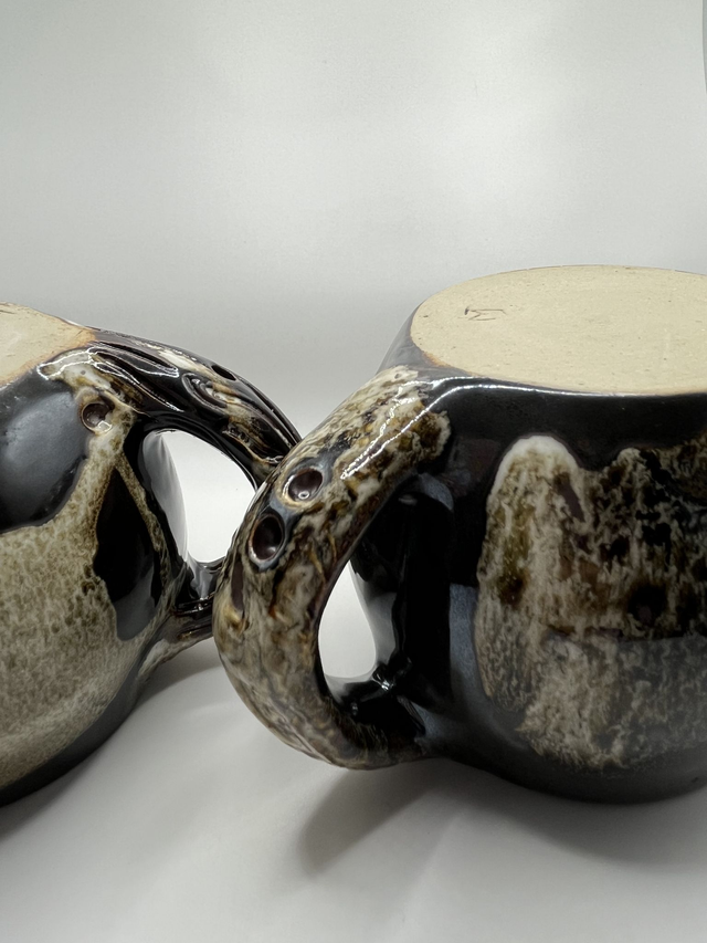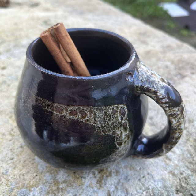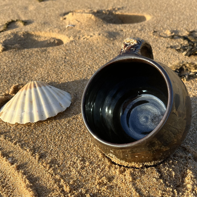 Mug en grès tourné à la main, pensé pour les boissons chaudes enveloppantes : thé, tisane, café allongé ou chocolat bien épais. Sa forme ronde se cale parfaitement dans les mains, pour réchauffer les doigts les soirs d’automne et d’hiver. L’émail Tenmoku révèle un brun très sombre, profond, avec un décor texturé plus clair : chaque cuisson crée ses propres nuances et reliefs.