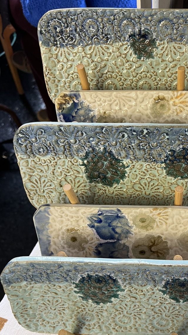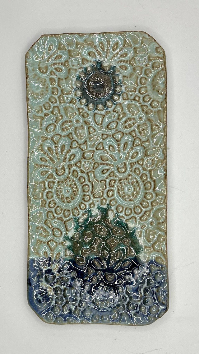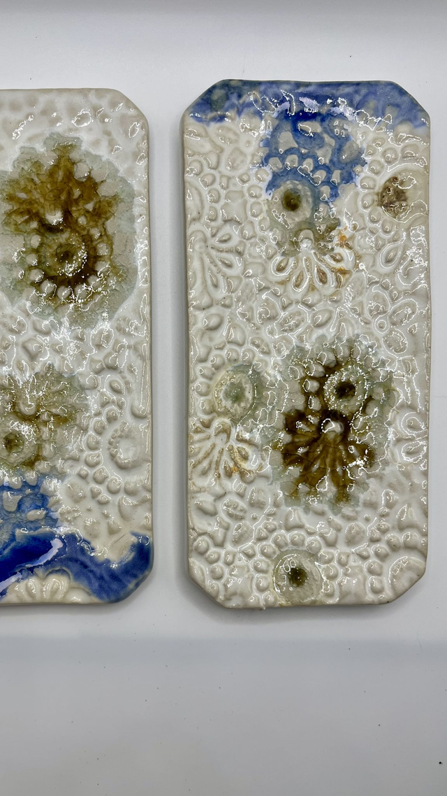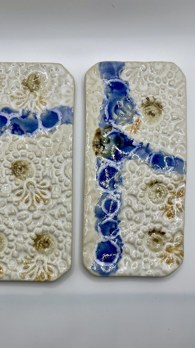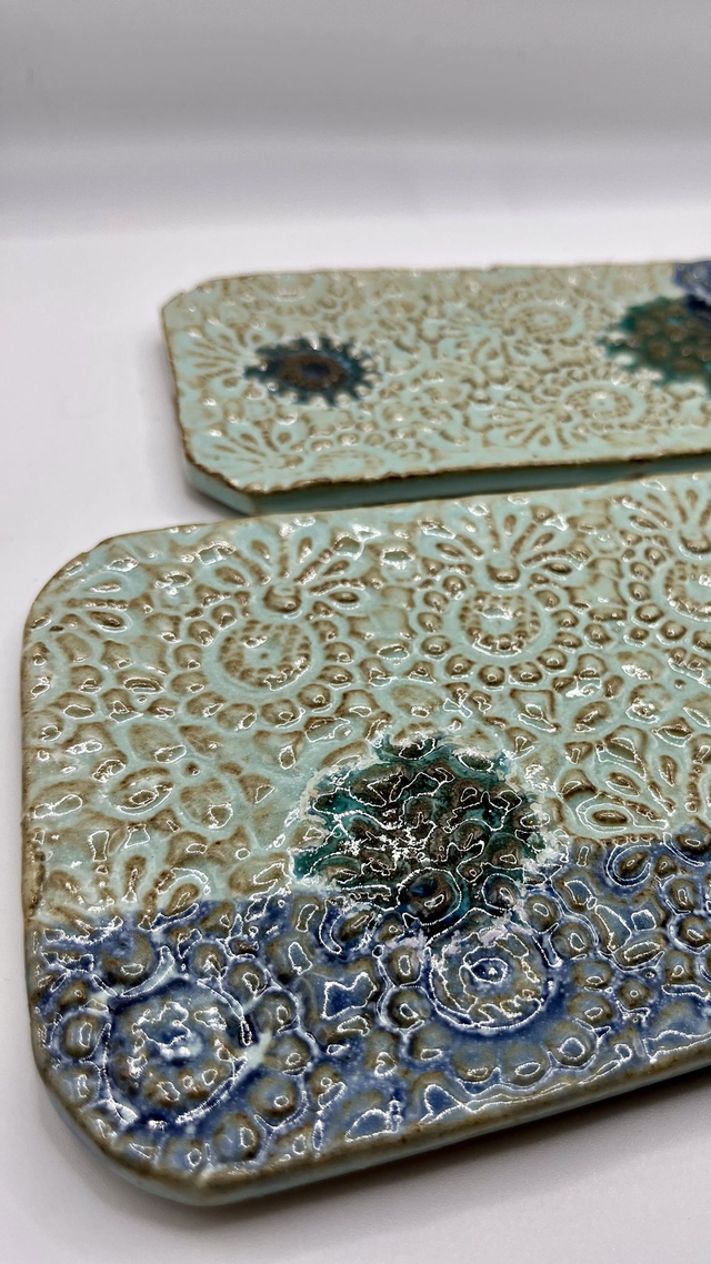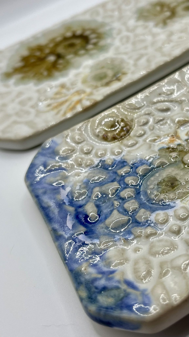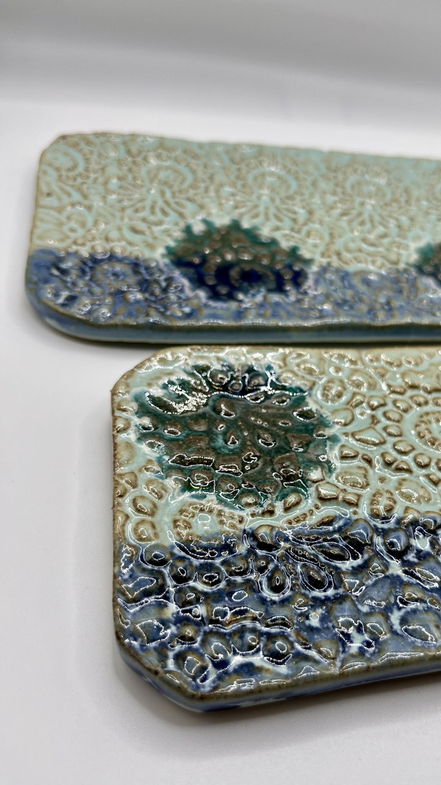Petit plat rectangulaire en grès façonné à la main, émaillé puis enrichi de gouttes de verre. À la cuisson, elles se fondent et créent des effets de profondeur, de brillance et de matière. Chaque pièce est unique : reliefs, nuances et coulures varient naturellement.