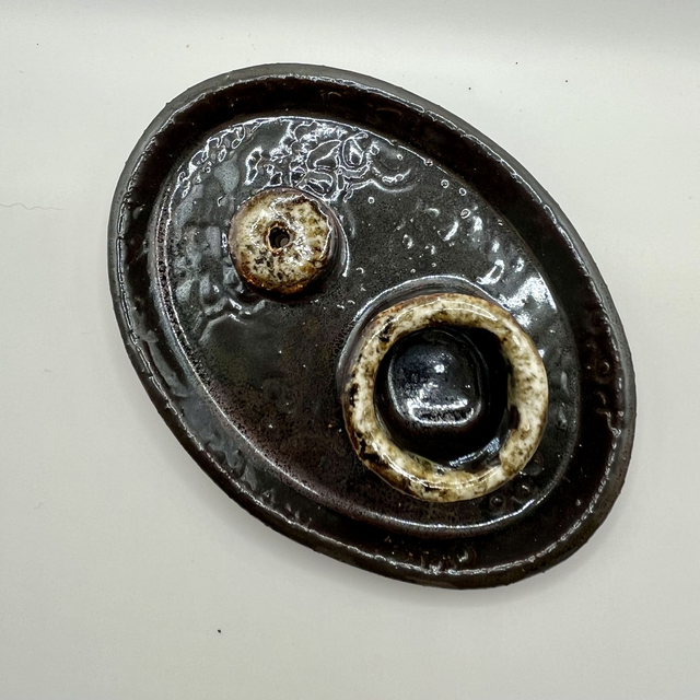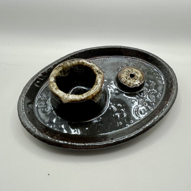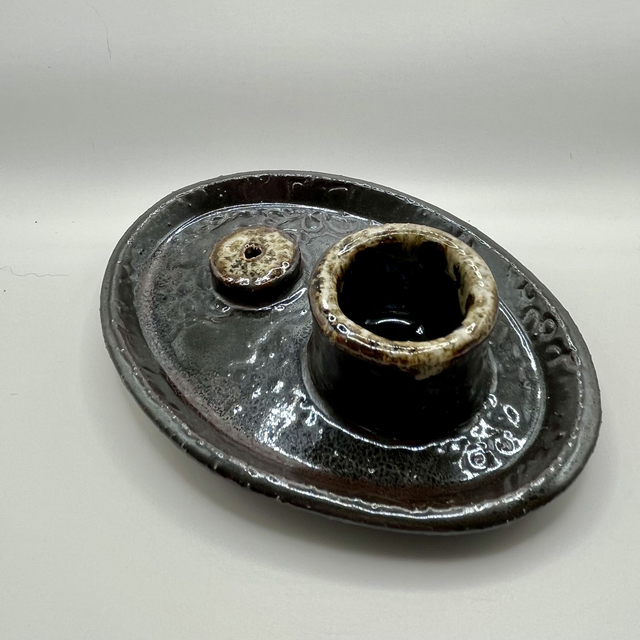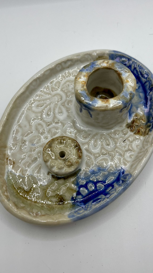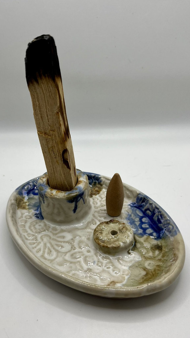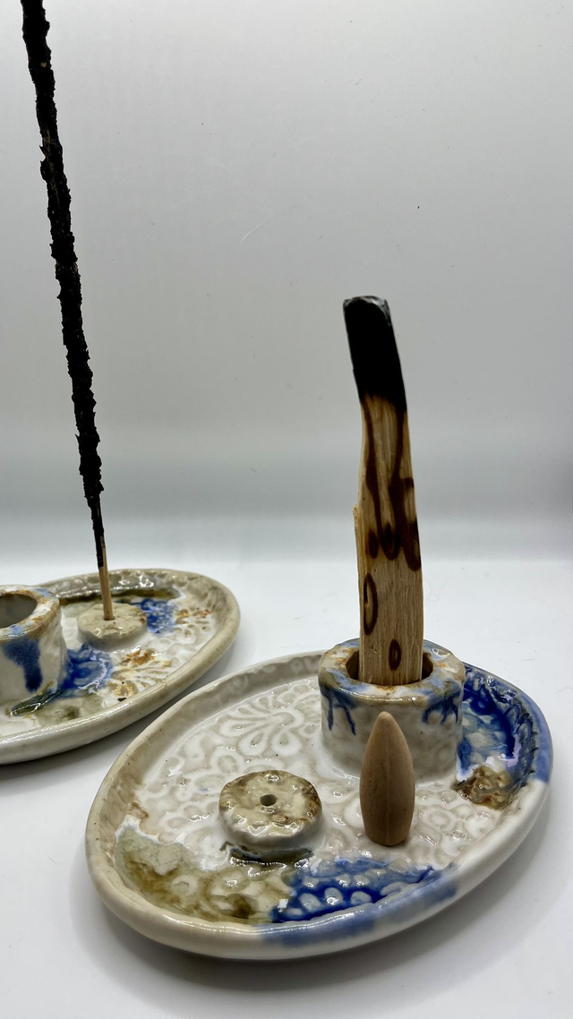 Le plateau émaillé propose deux espaces : un cylindre pour le palo santo / fagots d’herbes, et un support percé pour les bâtons. Objet à la fois pratique et contemplatif, idéal pour créer un coin calme à la maison. Chaque pièce est unique : nuances d’émail, empreintes et reliefs varient légèrement selon la cuisson.